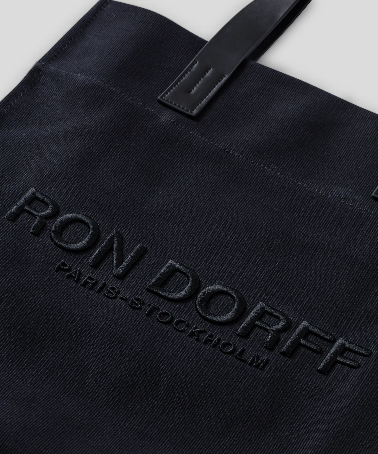 To accompany you on all your urban travels, this new bag will be ideal while combining practicality and elegance. It's made from thick coated canvas with tone-on-tone "RON DORFF" relief embroidery on one side. The handles are in leather and it closes with a matte black metal magnetic button. Inside, a compartment for your computer and a small pocket for more precious items. Dimensions : 43cm x 40cm x 14cm.