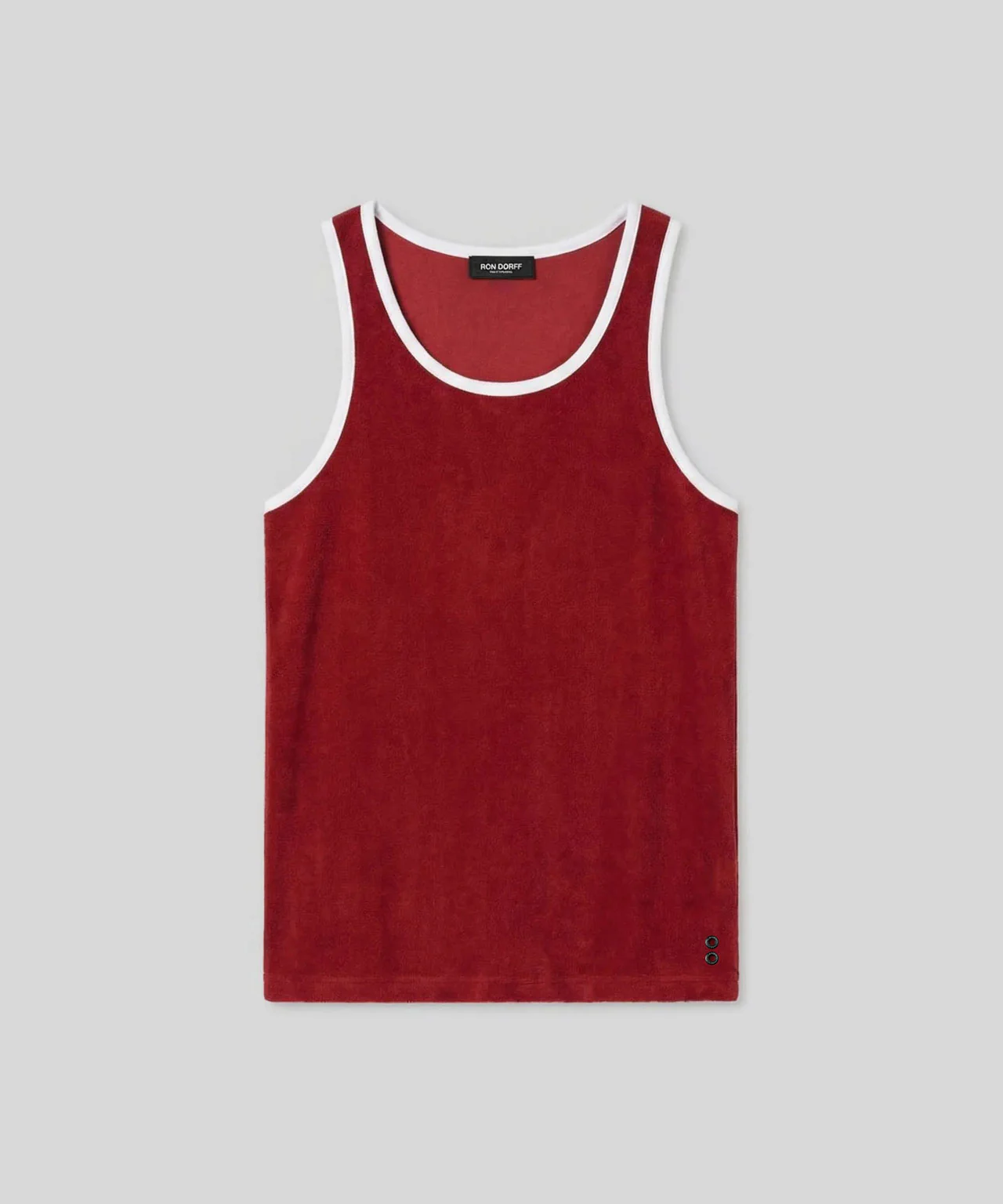 The new sports tank top has been designed in a lightweight, ultra-soft terry fabric made from organic cotton and recycled polyester. Terry is ideal for the beach and brings a retro touch. Revisited with white bindings for a sporty look. Two discrete embroidered RD eyelets tone on tone on the side