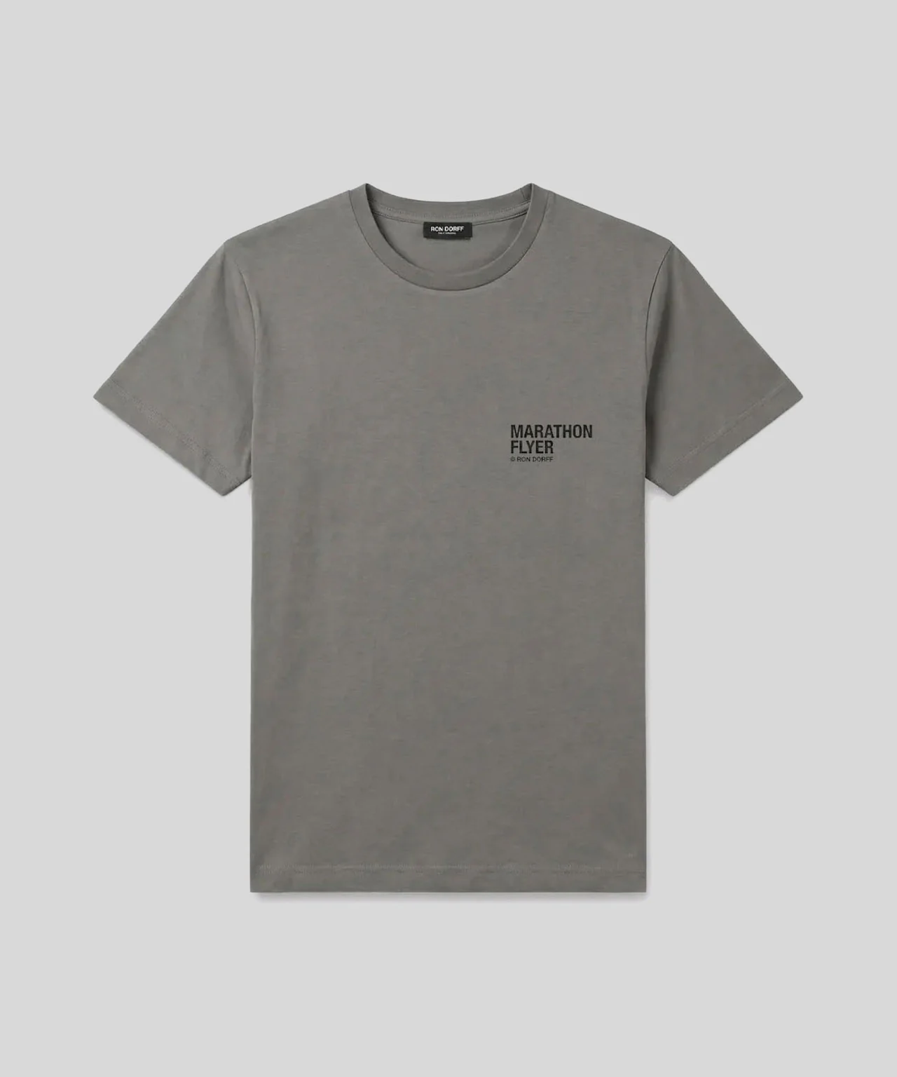 The classic RON DORFF t-shirt with "MARATHON FLYER" small chest screen print. Designed with a slightly tapered fit and cut in a premium 100% organic cotton jersey. Crew neck. Finished with ribbed collar. Pre-washed for minimum shrinkage.