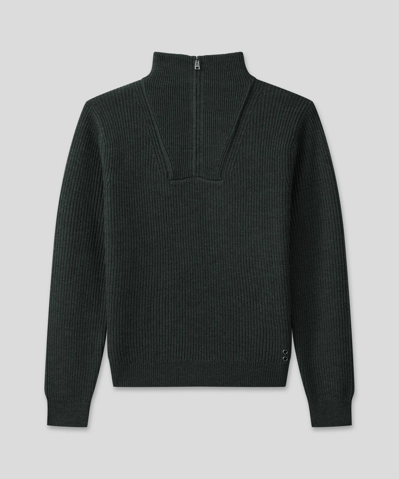 The zip-neck trucker sweater, knitted from merino wool, is inspired by vintage ski sweaters. It offers a clean silhouette while ensuring natural stretch and optimal comfort. Featuring the two discrete black-lacquered RD eyelets on the side.