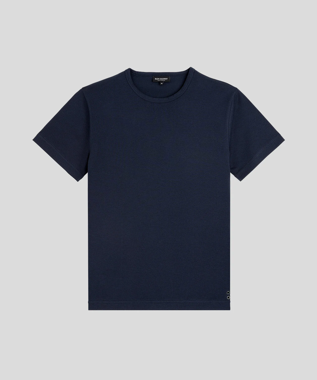 The classic no frills, no logo, RON DORFF t-shirt revisited in a 100% ultra-soft cotton. Designed with a slightly tapered fit. Crew neck with elegant binding collar for chic urban wear. Featuring the two discrete black-lacquered RD eyelets on the side.