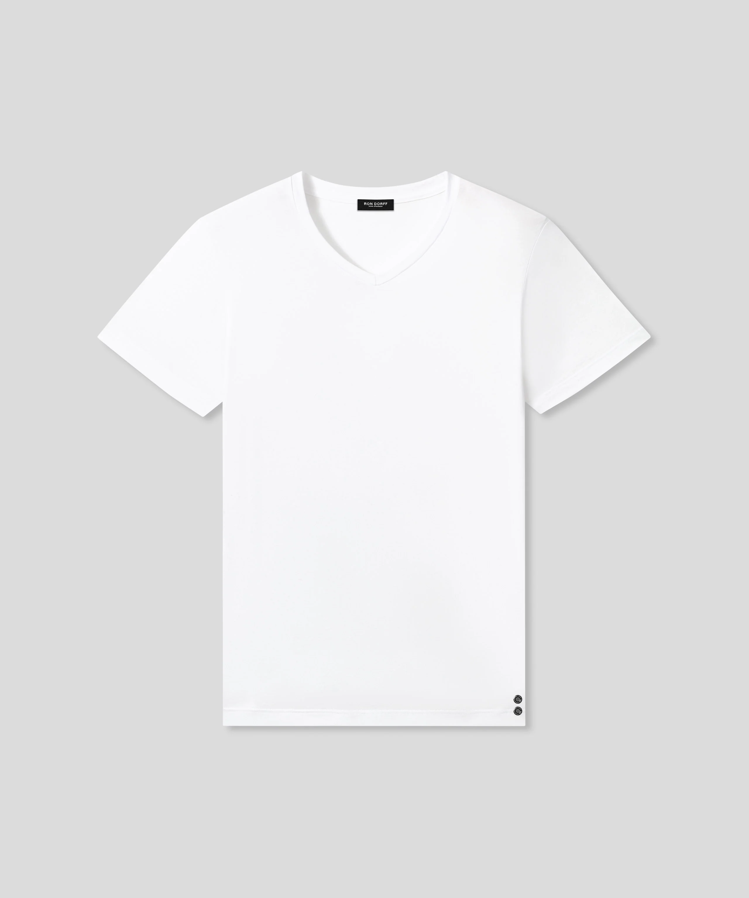 The new no frills, no logo, RD t-shirt upgraded in 100% ultra-soft cotton. Designed with a slightly tapered fit. V neck with elegant binding collar for chic urban wear. Featuring the double black-lacquered RD signature eyelets on the side.