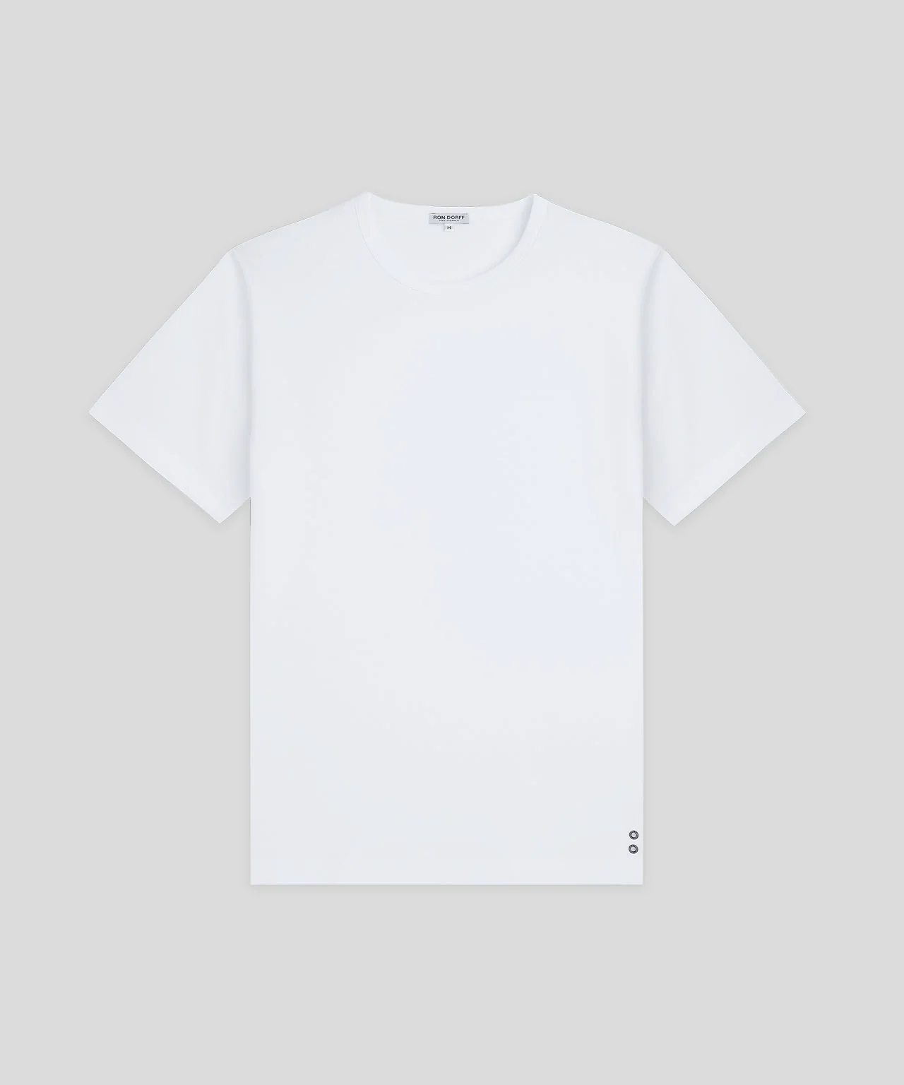 The classic no frills, no logo, RON DORFF t-shirt revisited in a 100% ultra-soft cotton. Designed with a slightly tapered fit. Crew neck with elegant binding collar for chic urban wear. Featuring the two discrete black-lacquered RD eyelets on the side.
